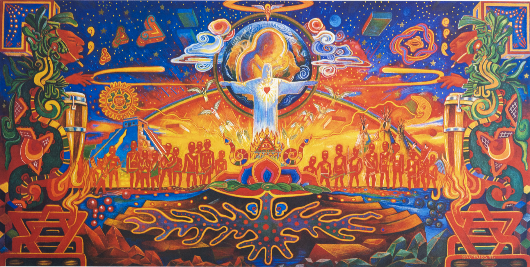 From igniting the Mission mural movement in the ’70s to creating iconic Carlos Santana album art and Fillmore posters, Rios has shaped the city’s visual and musical culture for decades. His synesthetic approach—where sound inspires color—bursts through every canvas, poster, and tapestry.